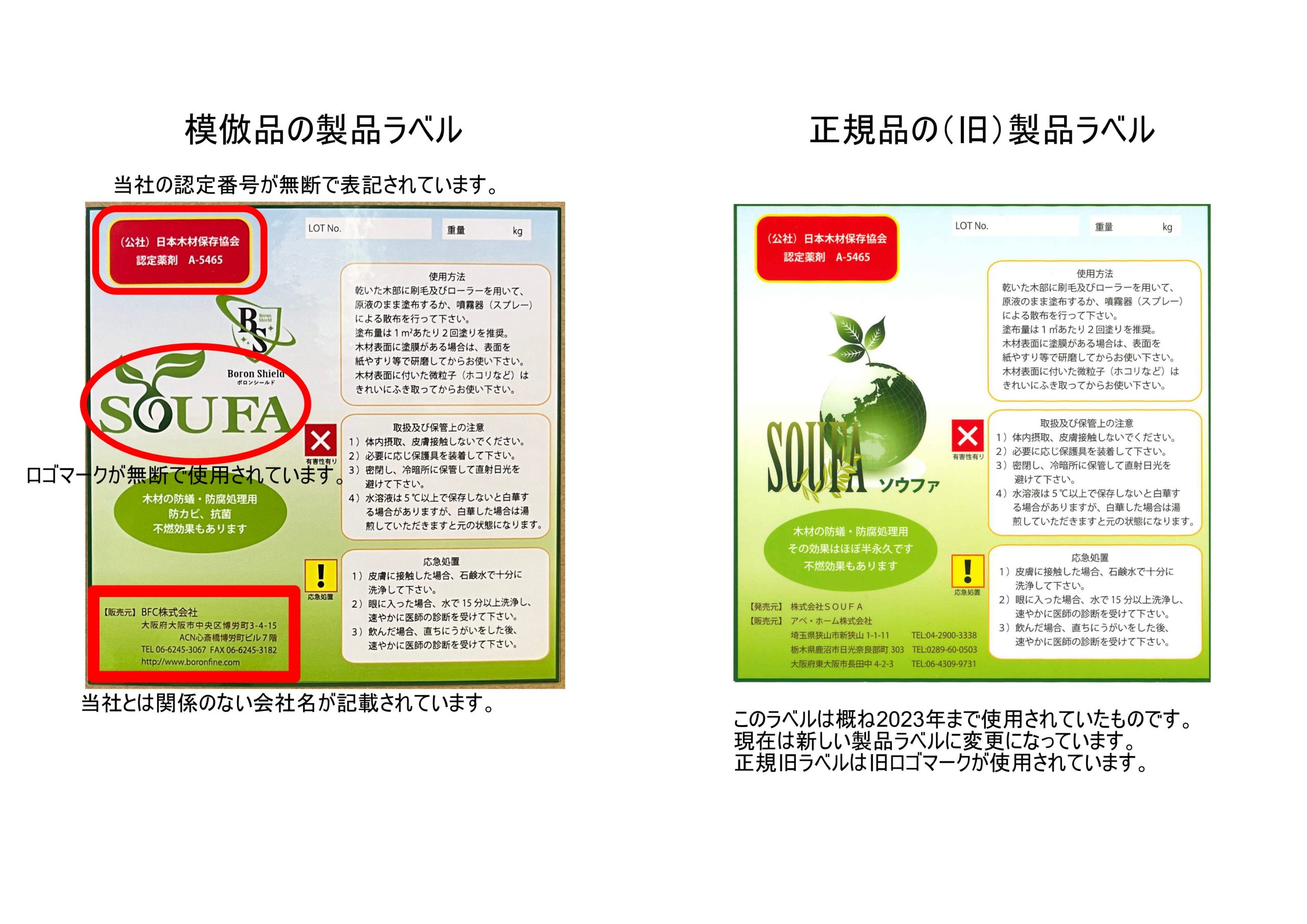 BFC株式會社網站上所記載的以及本公司用於銷售等目的的資料中所呈現的各種數據,包括SOUFA的防白蟻測試數據、防白蟻認證編號(A-5465、A-5470)等均為本公司的數據或認證編號。該公司也揭露了使用SOUFA的建築和培訓項目,給人的印像是使用了BFC產品。 BFC株式會社製造並銷售這些產品,其標籤被誤認為是其自有產品的性能和業績記錄。